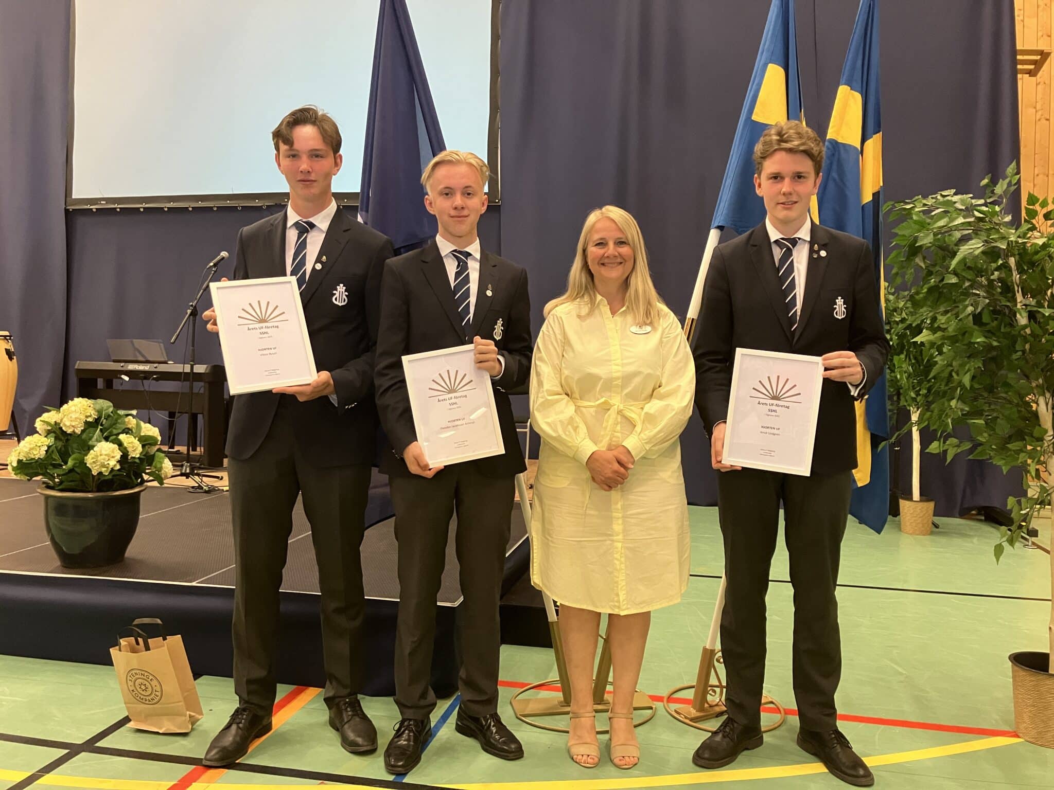 Lena Broo from Sigtuna Entrepreneurs Association awarded their scholarship to the UF company of the Year: Hjorten UF with students Arvid Lindgren, Theodor Jacobsson Almesjö and Viktor Bysell. Also nominated UF companies were DryBites UF (Theodor Wahlquist, Melker Malmros Stavås, Travis Rooker, Fredrick Hodgson, Victor Bornmark) and Jackpot UF (Isabella Nordmyr, Ellen Engwall).