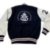 Klassisk, blå och vit jacka som stängs med knappar. Ärmar i skinn och fram/baksida i ull. Vit brodyr fram och stor vit brodyr på ryggen.
